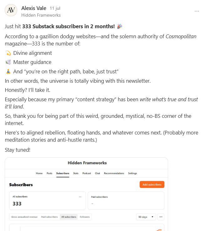 I even posted a Substack Note joking that, according to “a gazillion dodgy websites—and the solemn authority of Cosmopolitan magazine"—333 subscribers meant I was on the right path.